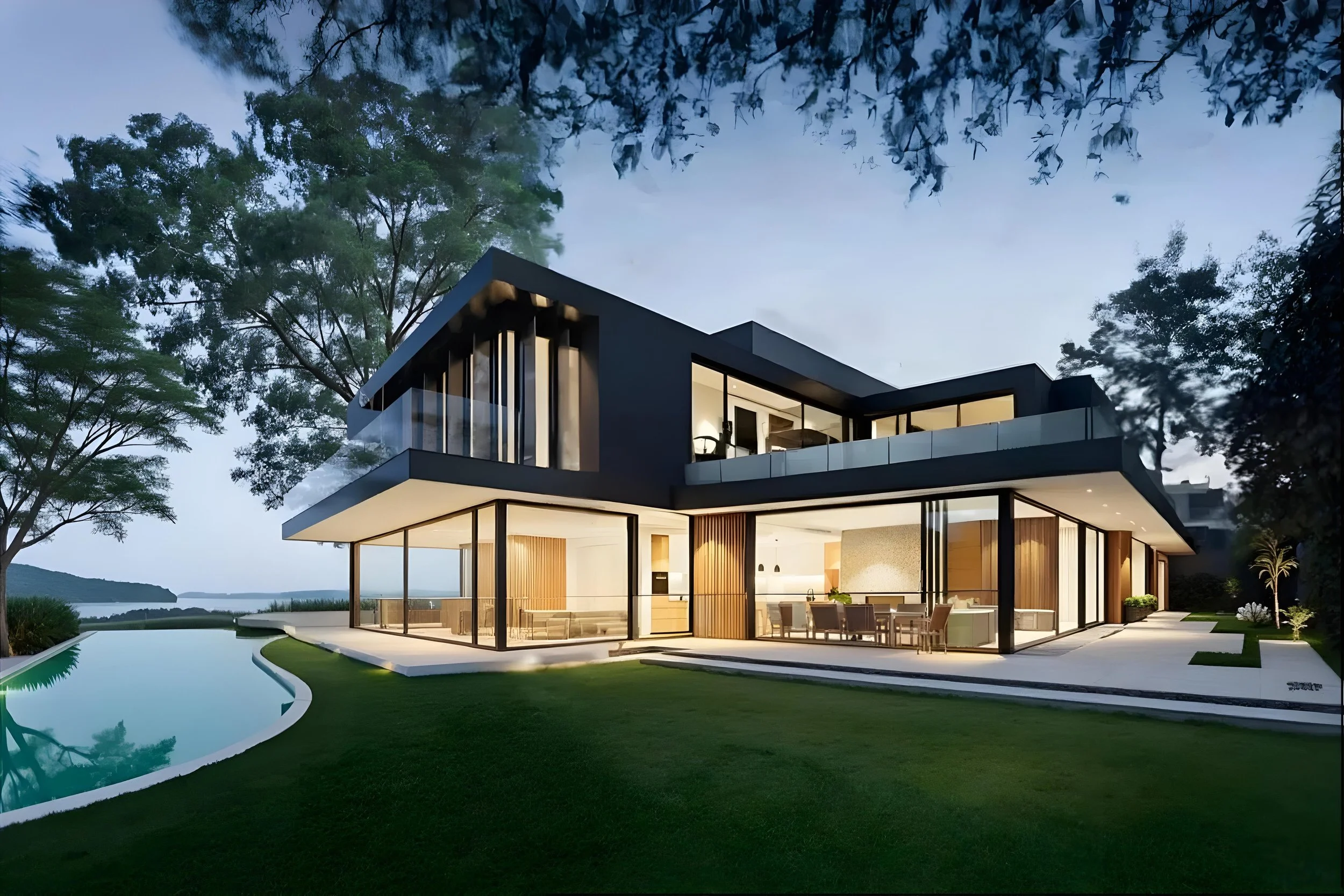 Modern two-story house with a pool, surrounded by green grass and trees, featuring large glass windows.